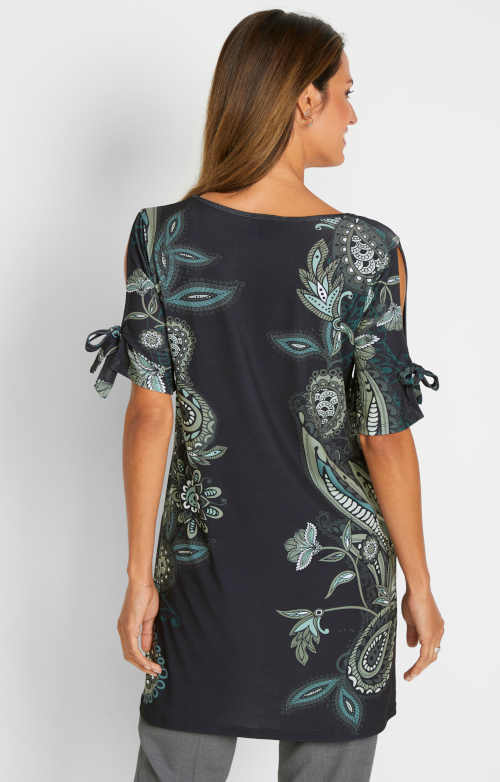 Žerzejová tunika v módní kombinaci olivové s černou a působivým vzorem vnese tu správnou vzpruhu do vašeho šatníku. A hlavně oživí váš outfit, ať už do zaměstnání, na výlet, do společnosti, do města apod. Předností je, že tento model využijete při jakékoli příležitosti. Získá si vás moderním vzorem a komfortním střihem. Rovněž díky příjemnému, kvalitnímu materiálu se dobře nosí. Perfektně sedí. Lichotí postavě a zároveň efektivně skryje i drobné nedostatky. Model je řešen kulatým výstřihem, průstřihem na ramenou a ozdobným zavázáním na konci krátkého rukávu. Top v prodloužené délce je zakončen do rovného lemu.
